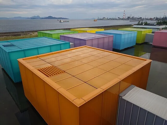 池に浮かんだカラフルなコンテナは美術品の展示室。パズルのように動かしていろんな配置にできるそう。海の向こうには大竹のコンビナート。